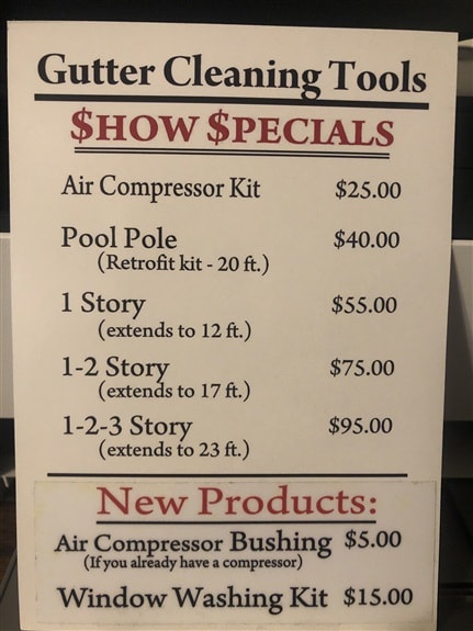 We have Show Specials for all our gutter tools: 1 Story- $55. 1-2 Story - $75. And 1-2-3 Story- $95. ALL OF OUR GUTTER CLEANING TOOLS ARE UNDER $100.